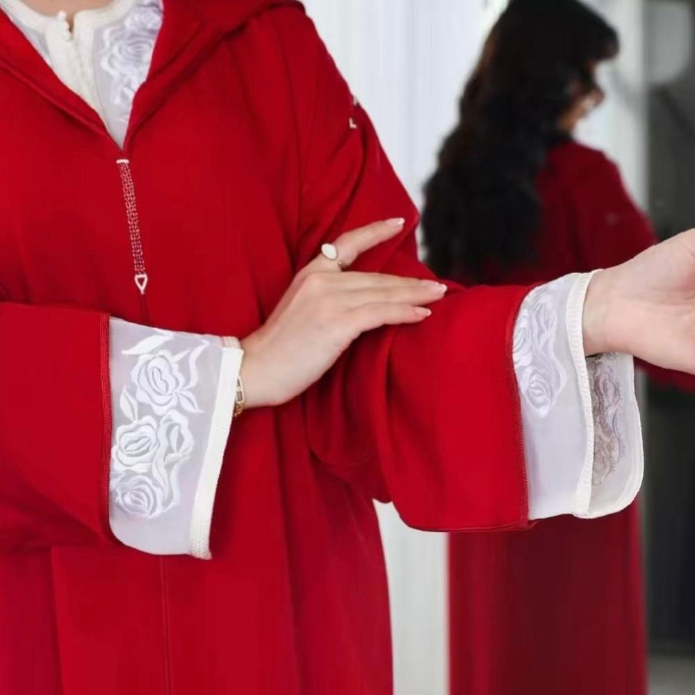 جلابة حمراء وبيضاء تجمع بين الحيوية والأناقة بتصميم مميز يبرز جمالك بألوان متناسقة تعكس ذوقًا رفيعًا وتمنحك إطلالة متجددة تناسب كل المناسبات بكل ثقة ورقي