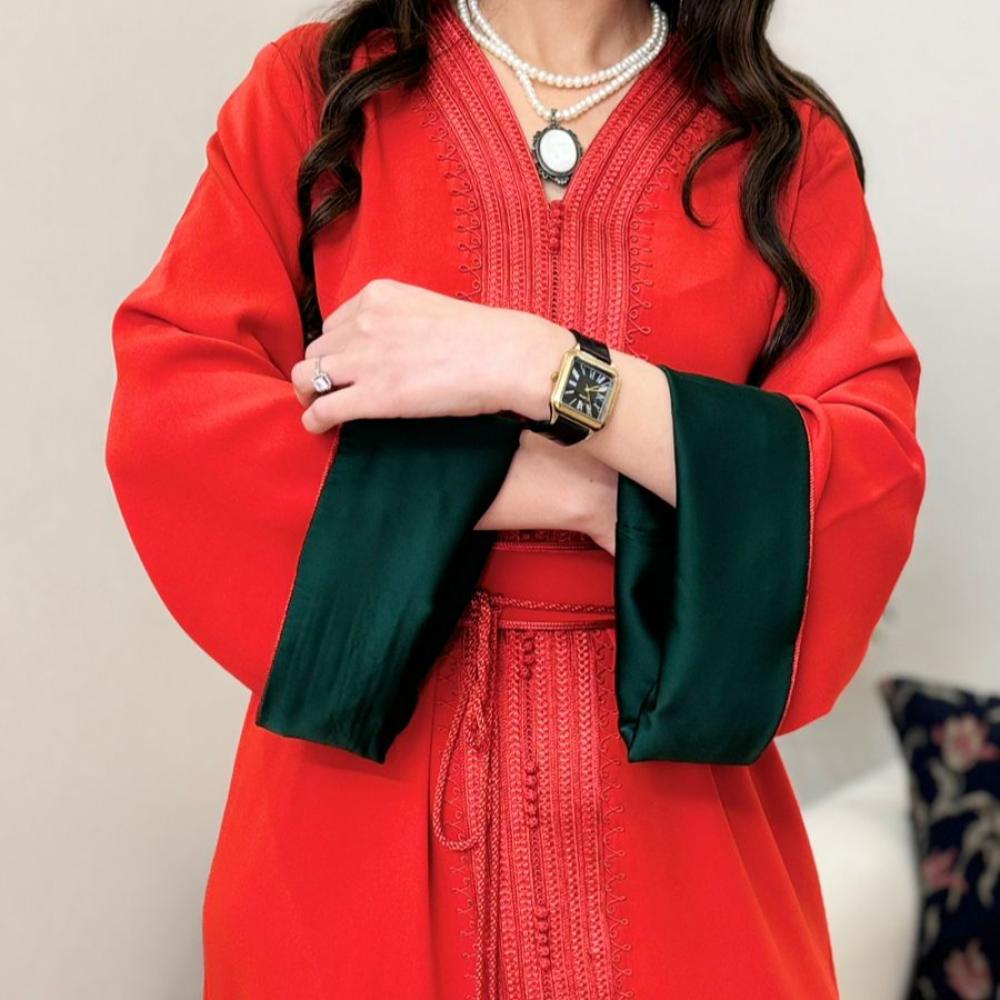قفطان برتقالي محمر يبرز أناقة فريدة بألوان دافئة وطبقة مبطنة خضراء تضفي تباينًا مميزًا يعكس ذوقًا رفيعًا وروحًا عصرية تناسب مختلف المناسبات وتلفت الأنظار بجمالها ورقيها