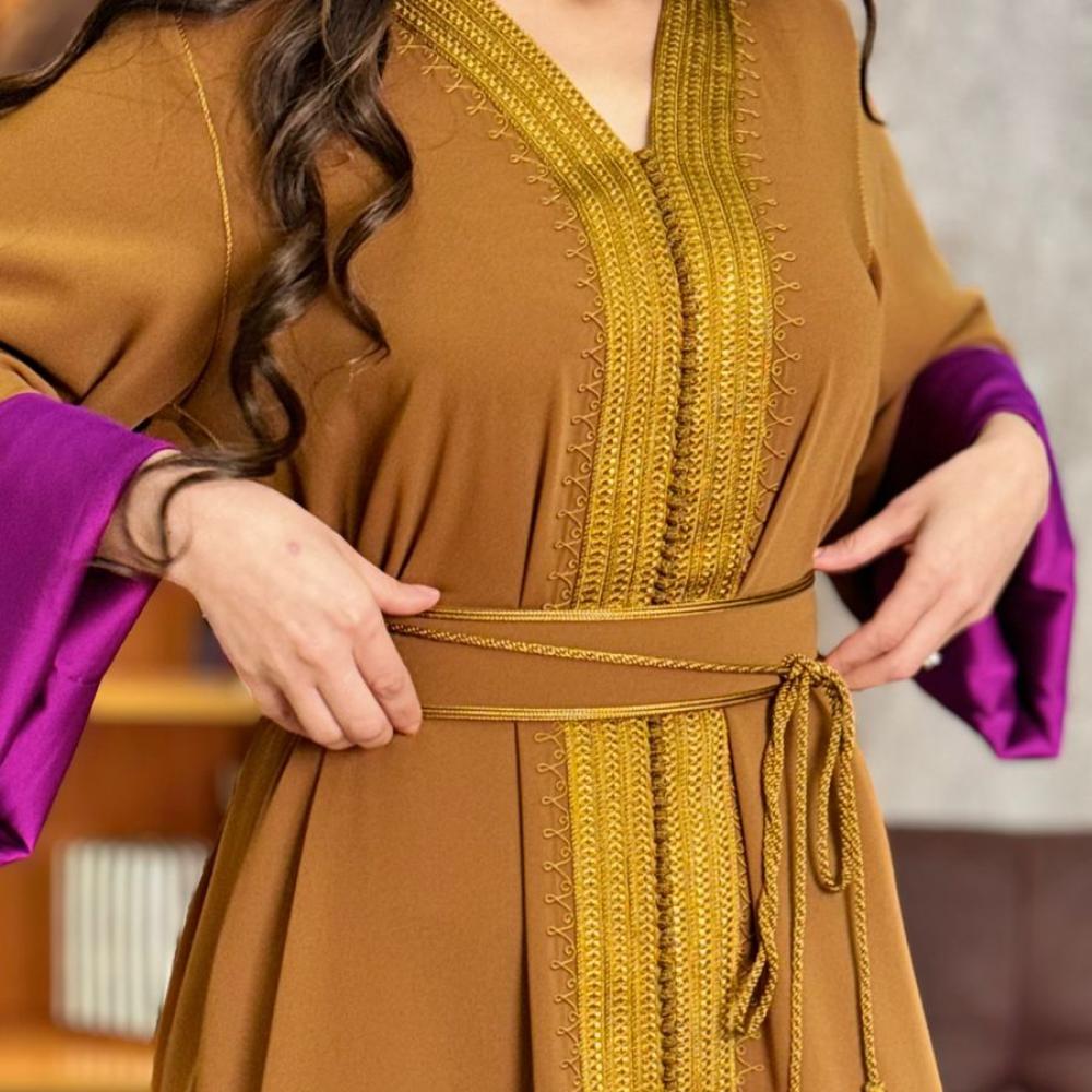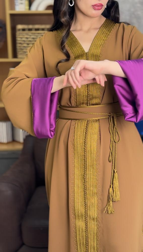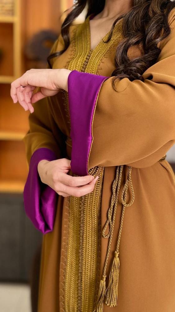 قفطان مغربي ذهبي مبطن بنفسجي يجمع بين الأناقة والراحة يبرز جمال التصميم والتطريز اليدوي ليمنحك إطلالة مميزة وفريدة تعكس تراثاً غنياً ولمسة عصرية تناسب كل المناسبات الخاصة والسهرات